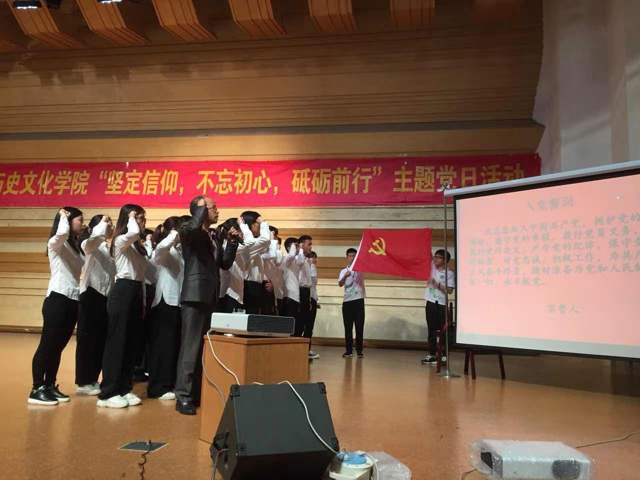 主题党日活动在庄严的《国际歌》中拉开序幕。“我志愿加入中国共产党,拥护党的纲领,遵守党的章程,履行党员义务......”在公司党委副书记、副经理李朝军的带领下,梁东玲等49名新党员佩戴党徽并进行集体宣誓。新党员面向党旗,举起右手,庄严宣誓,表达对党的忠诚、为共产主义事业奋斗终生的决心。随后,新党员代表蔡慧婷同学与大家分享了自己的感想。表示要牢记入党誓词,不忘初心,无愧于中国共产党的光荣称号。