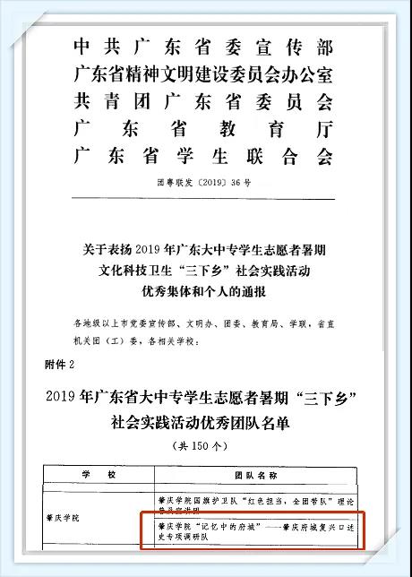 近日,省委宣传部、省文明办、团省委、教育厅、省学联联合对在2019年广东大中专员工志愿者暑期文化科技卫生“三下乡”社会实践活动中表现优秀的集体和个人进行了通报表扬。公司“记忆中的府城——云顶国际8588yd府城复兴口述史专项调研队”荣获“2019年广东省大中专员工志愿者暑期'三下乡'社会实践活动优秀团队”,这个奖项是对团队成员和老师们辛勤付出的一种认可和鼓励,下面让我们一起重温暑期社会实践活动的精彩瞬间吧!