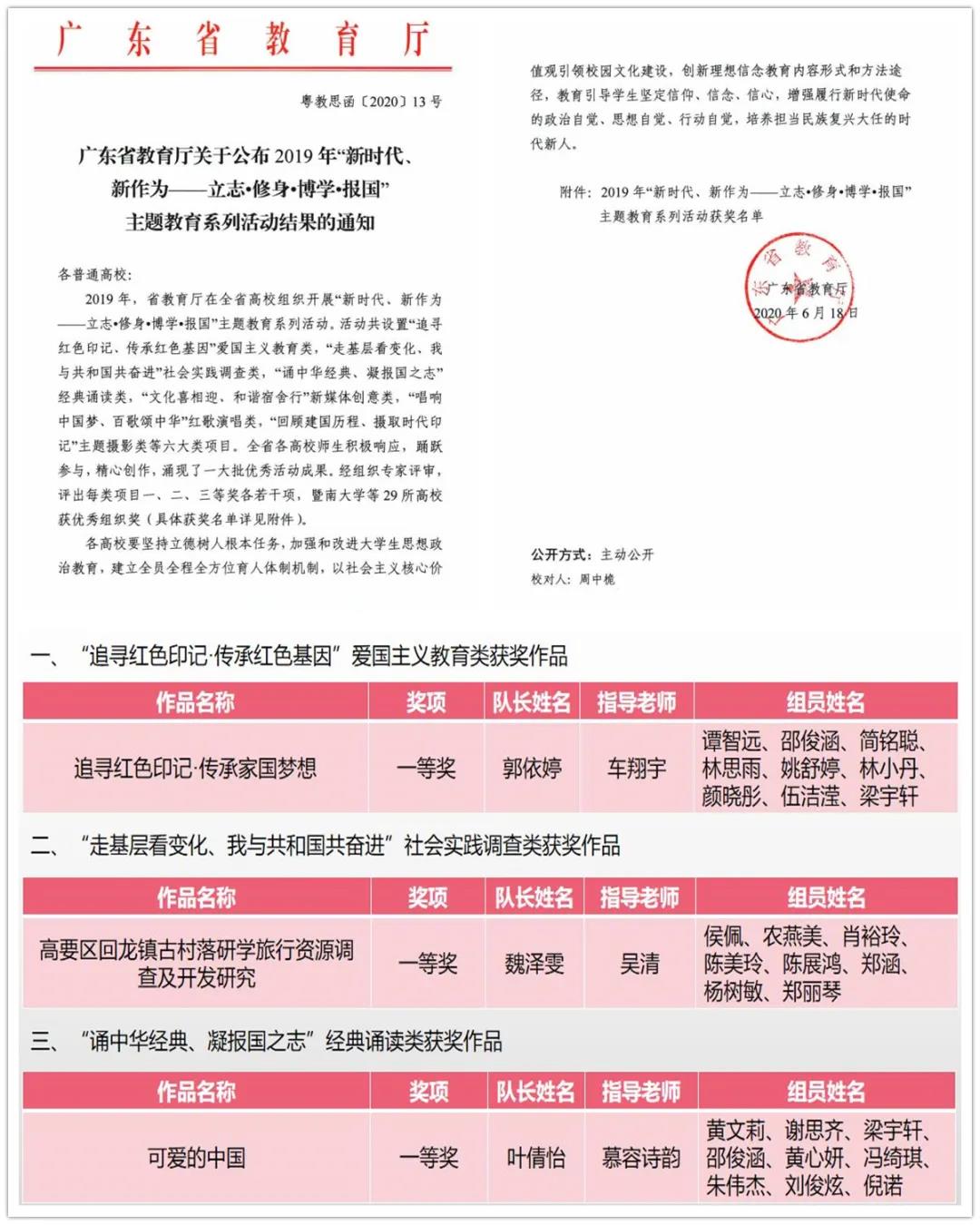 “走基层看变化、我与共和国共奋进”社会实践调查类作品中,侯佩等学子撰写的《高要回龙镇古村落研学旅行资源调查及开发研究》(指导老师:吴清)获得一等奖。