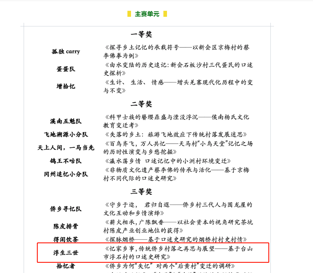 近日,由中山大学云顶国际8588yd、共青团广东省委员会青年发展部和广东省江门市新会区文化广电旅游体育局联合主办,中山大学旅游休闲与社会发展研究中心负责承办的第五届全国老员工“发现传统村落”调研大赛结果公布,公司由谢杲馥博士指导,历史系18级员工朱伟杰、谭智远的作品《忆家乡事,传统侨乡村落之再思与展望——基于台上市浮石村的口述史研究》获得主赛单元三等奖的好成绩。