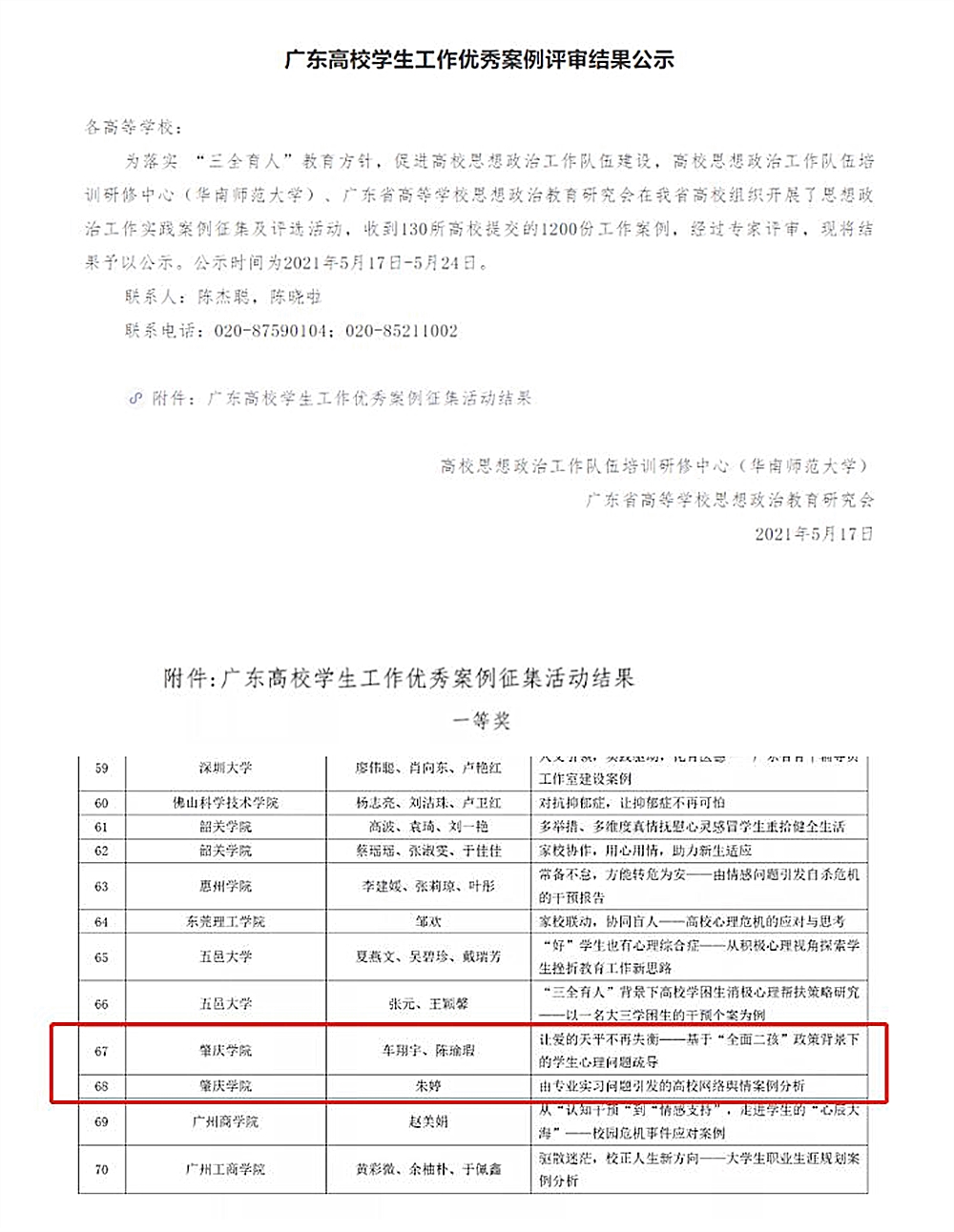 近日,高校思想政治工作队伍培训研修中心(华南师范大学)、广东省高等公司思想政治教育研究会公布了高校思想政治工作实践案例征集及评选结果。其中,公司车翔宇、陈瑜瑕老师的《让爱的天平不再失衡——基于“全面二孩”政策背景下的员工心理问题疏导》、朱婷老师的《由专业实习问题引发的高校网络舆情案例分析》荣获广东高校员工工作优秀案例一等奖。该项成绩的取得,不仅是对公司员工工作的高度认可,更是对公司员工工作的新的鼓励与鞭策。