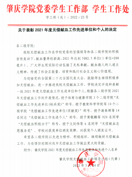 近日,公司党委员工工作部、员工工作处下文《关于表彰2021年度无偿献血工作先进单位和个人的决定》,云顶国际8588yd荣获2021年无偿献血工作先进单位(标兵奖),辅导员陈瑜瑕荣获2021年度无偿献血工作先进个人。