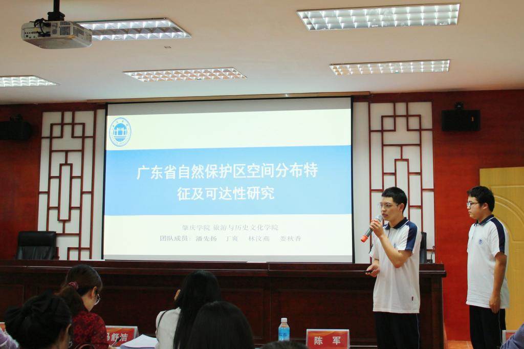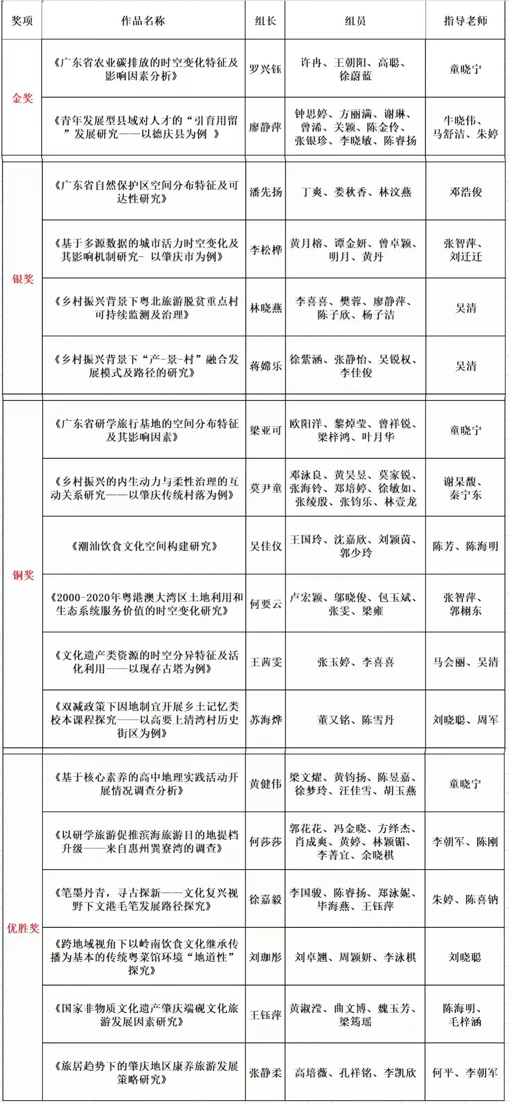 经激烈角逐,最终《青年发展型县域对人才的“引育用留”发展研究——以德庆县为例 》团队、《广东省农业碳排放的时空变化特征及影响因素分析》团队获得金奖,《广东省自然保护区空间分布特征及可达性研究》等4个团队获得银奖,《广东省研学旅行基地的空间分布特征及其影响因素》等6个团队获得铜奖,《笔墨丹青,寻古探新——乡村振兴背景下文港镇毛笔产业发展策略及传承研究》等6个团队获优胜奖。