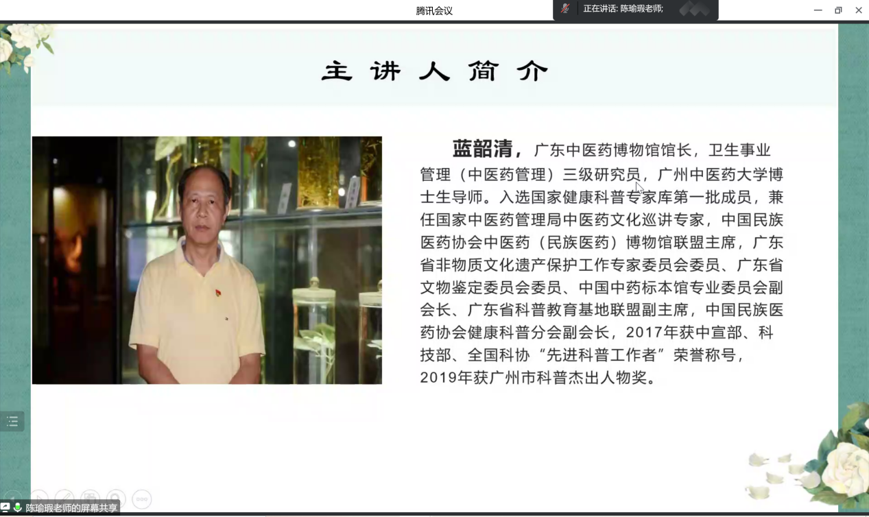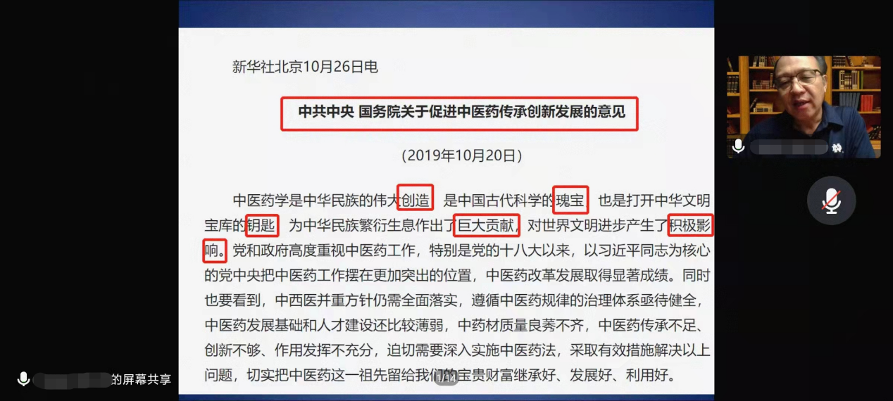 习近平总书记指出:“中华优秀传统文化是中华民族的精神命脉”,而中医药学“是打开中华文明宝库的钥匙”。为弘扬中医药文化,加强同学们对中医药的认识和了解,12月4日,云顶国际8588yd文旅讲坛(第84讲)于线上开讲。蓝韶清馆长以《中医智慧与文化自信》为题向同学们阐述了中医药文化的发展历程与价值底蕴,公司党委书记杨雪梅、2021级员工代表共计180余人参加讲座,陈瑜瑕老师主持。