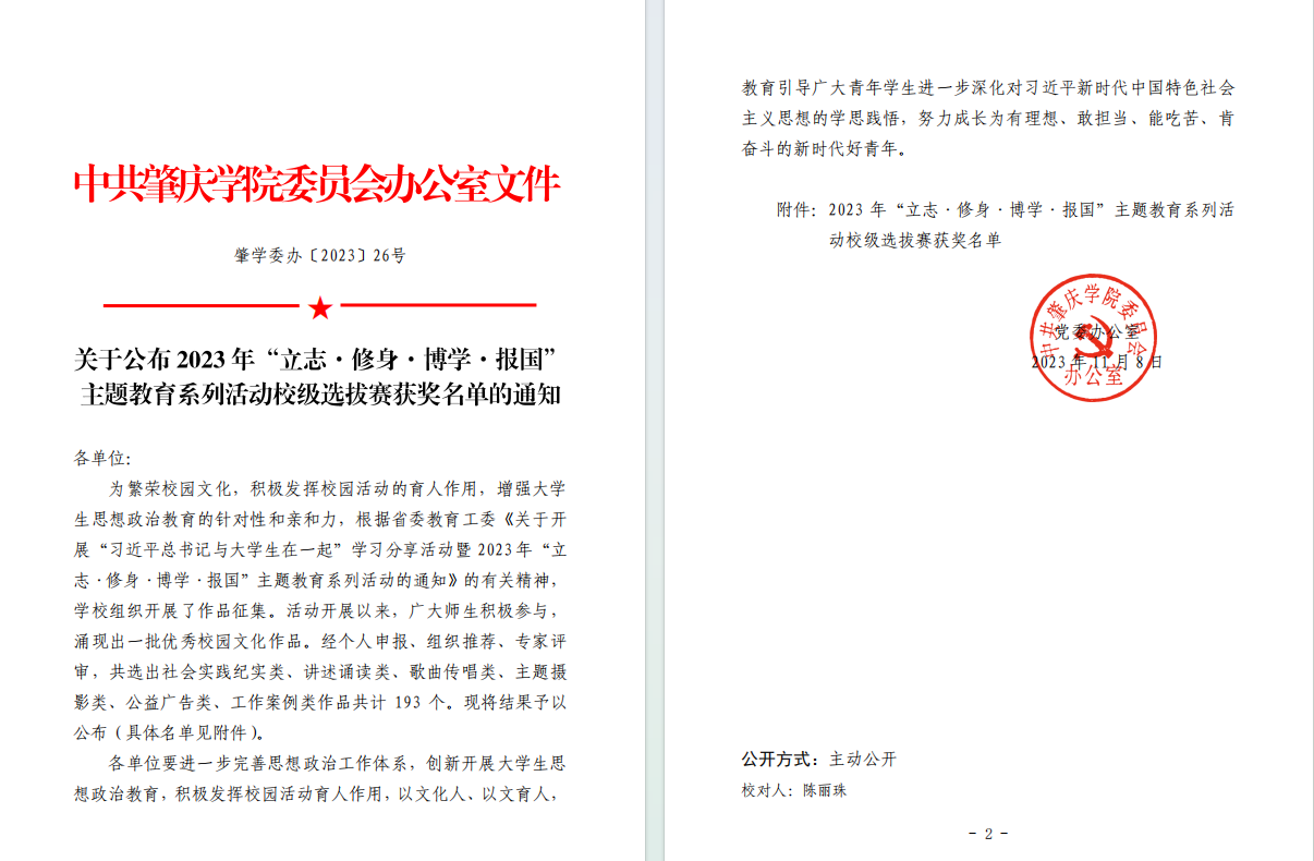 近日,公司公布2023年“立志·修身·博学·报国”主题教育系列活动校级选拔赛获奖名单的通知。公司多位老师指导的项目获奖。获奖名单如下: