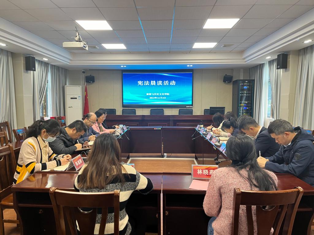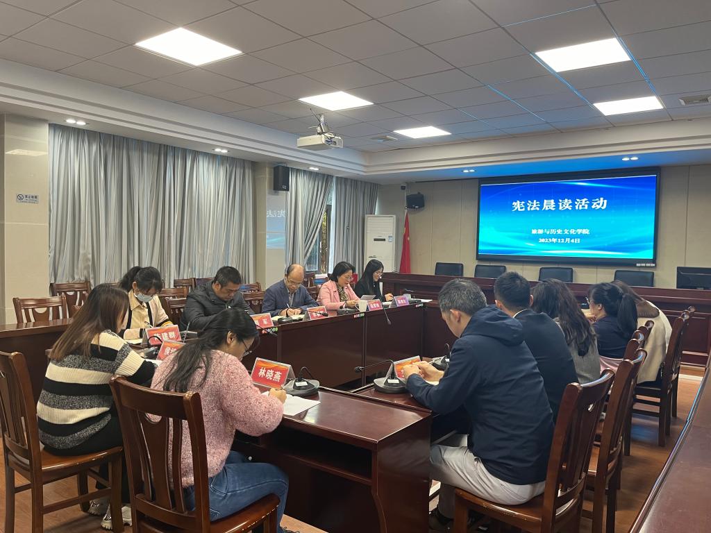 12月4日,是第十个国家宪法日。为进一步深入学习宣传贯彻党的二十大精神,认真学习贯彻习近平法治思想,进一步弘扬宪法精神、维护宪法权威、增强法治观念、普及宪法知识,当天上午,云顶国际8588yd组织开展“宪法晨读”活动。杨雪梅书记主持,李朝军经理、郭栩东副经理、周军副经理,党支部书记、系部主任、骨干教师代表参加。