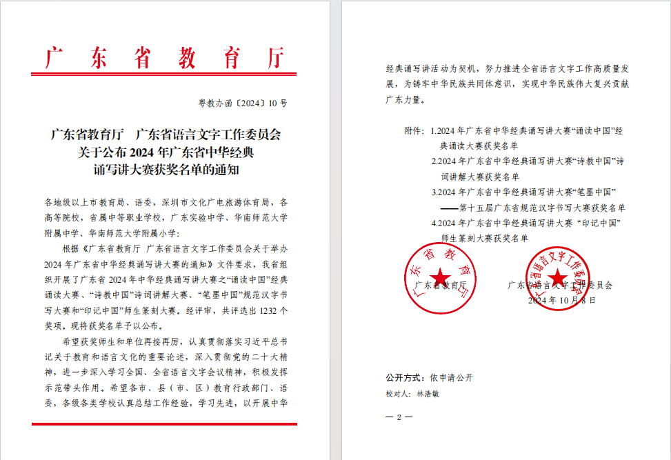 近日,广东省教育厅、广东省语言文字工作委员会公布 2024 年广东省中华经典诵写讲大赛获奖名单,公司杜云南博士荣获2024年广东省中华经典诵写讲大赛教师组(硬笔)优秀奖。