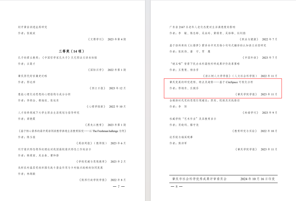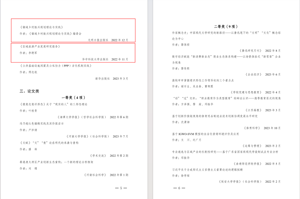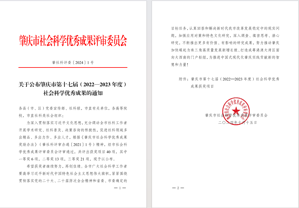 近日,肇庆市社会科学优秀成果评审委员会公布了肇庆市第十七届(2022-2023年度)社会科学优秀成果名单,共有40项成果获奖。公司郭栩东教授喜获论文类成果三等奖,李朝军副教授喜获著作类成果三等奖。郭栩东、李朝军为副主编,刘迁迁、陈海明、张智萍、唐伟、童晓宁、廖继武等老师(按照姓氏笔画排序)参与撰写的《镇域乡村振兴规划理论与实践》获著作类集体成果三等奖。
