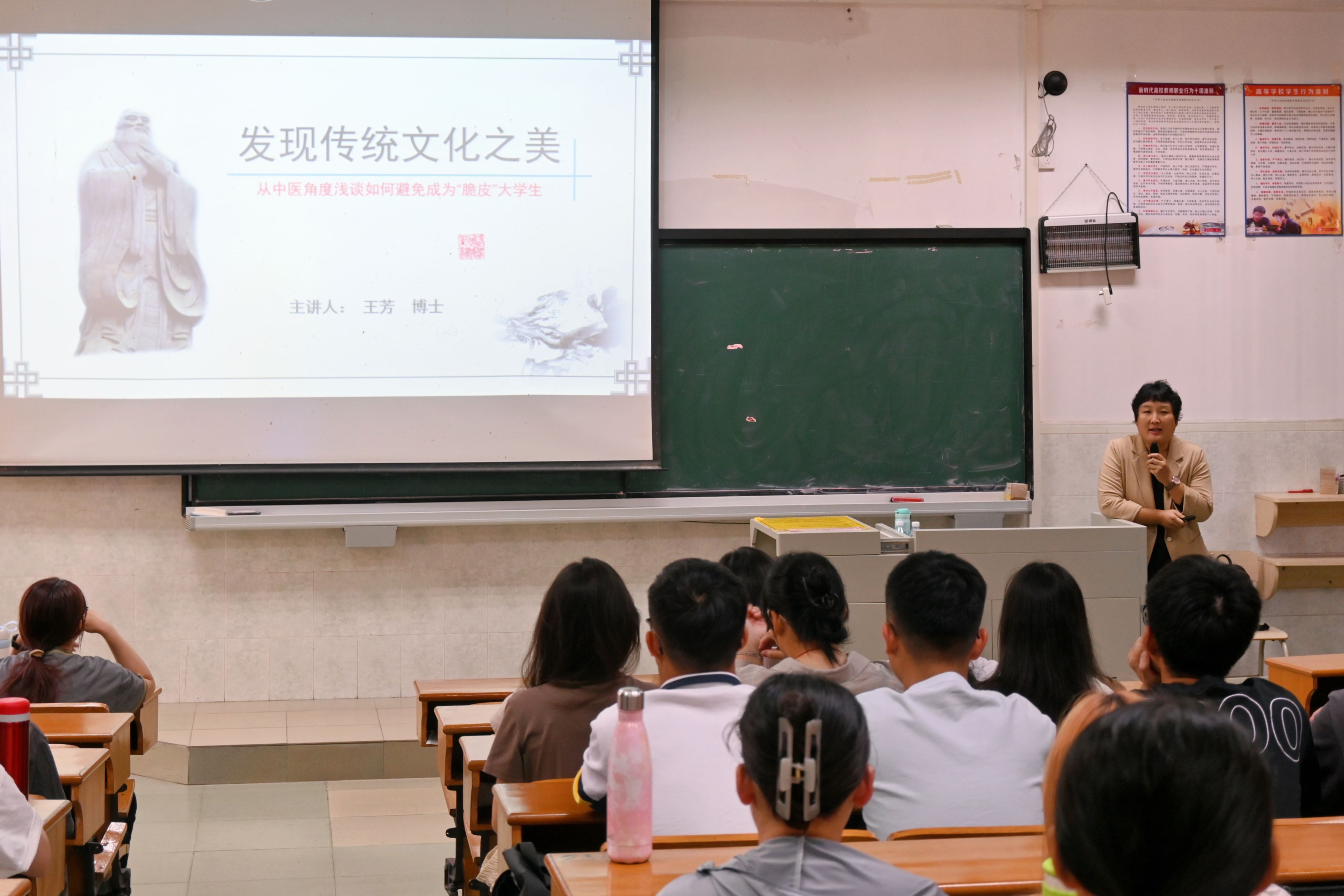 讲座中,王芳博士以中医与传统文化的关系为切入点,向同学们介绍了中医文化的来源、中医学理论和中医四大经典著作。她结合实际案例,用幽默的语言将抽象的中医理论变得生动具体,向同学们分享了四点建议:第一,顺应四时,外辟邪气;第二,劳逸适度,锻炼身体;第三,饮食有节,起居有常;第四,调摄情志,形神共养。她强调,健康的生活方式和良好的精神状态才是养生的重点所在。