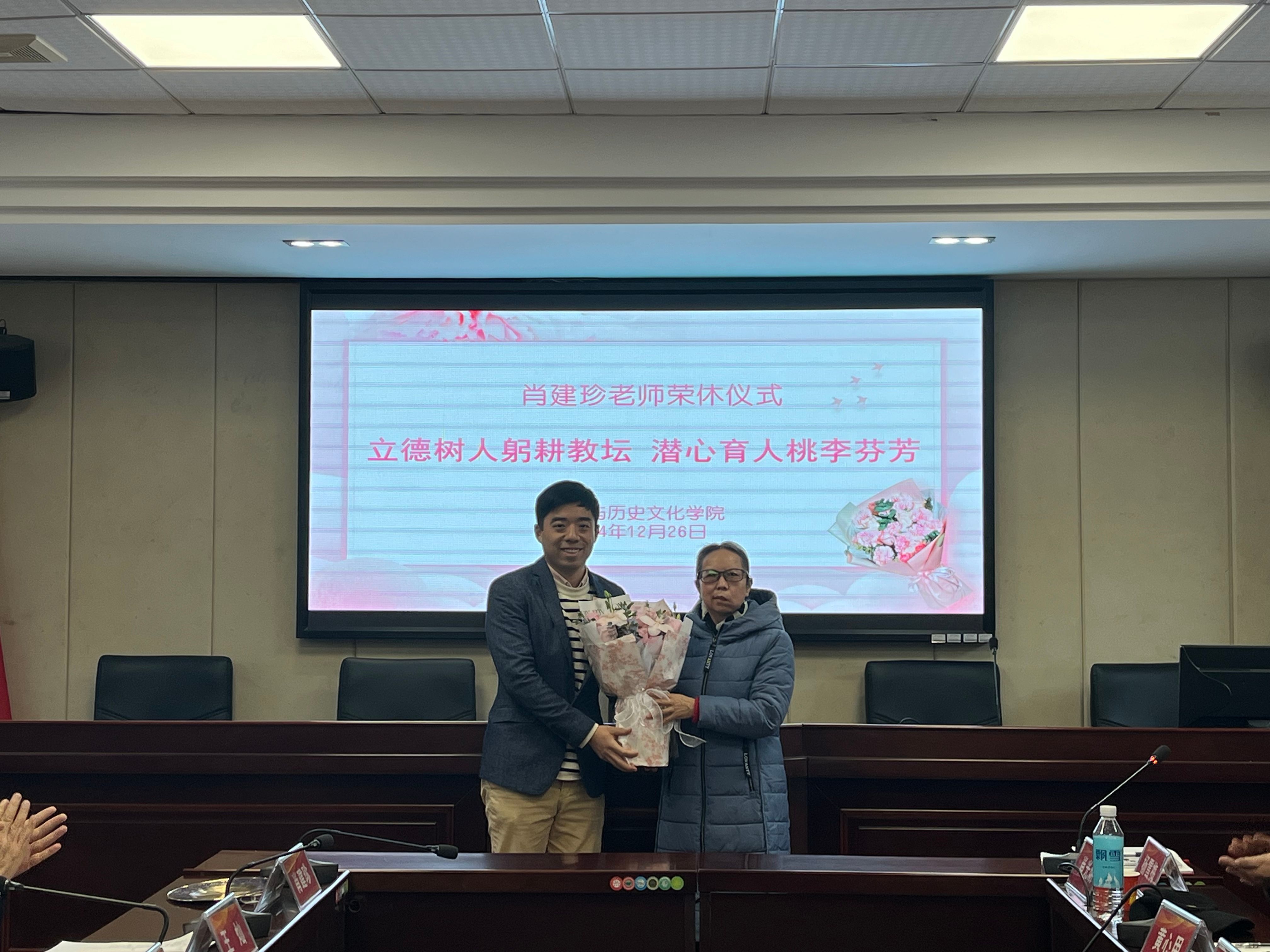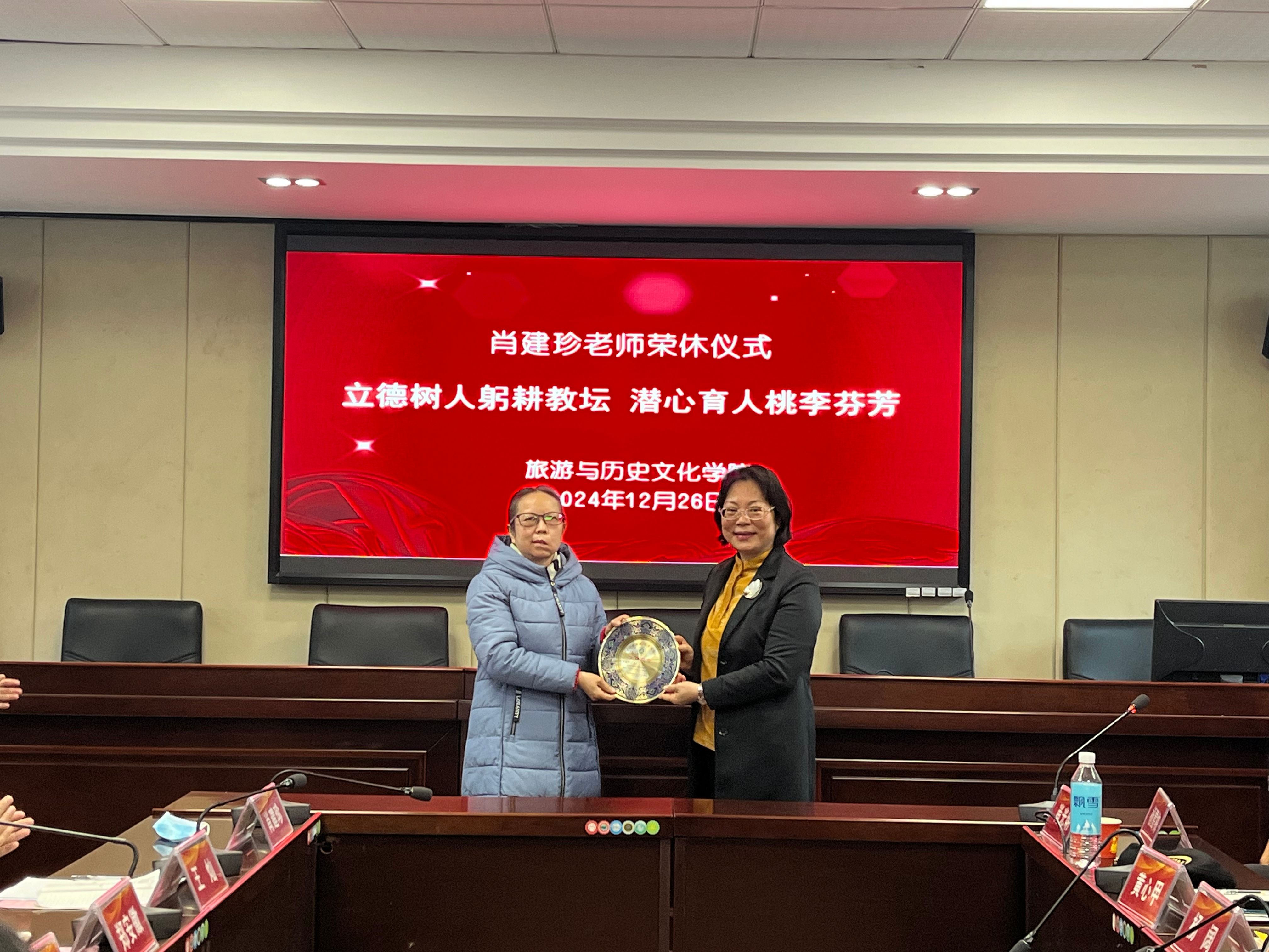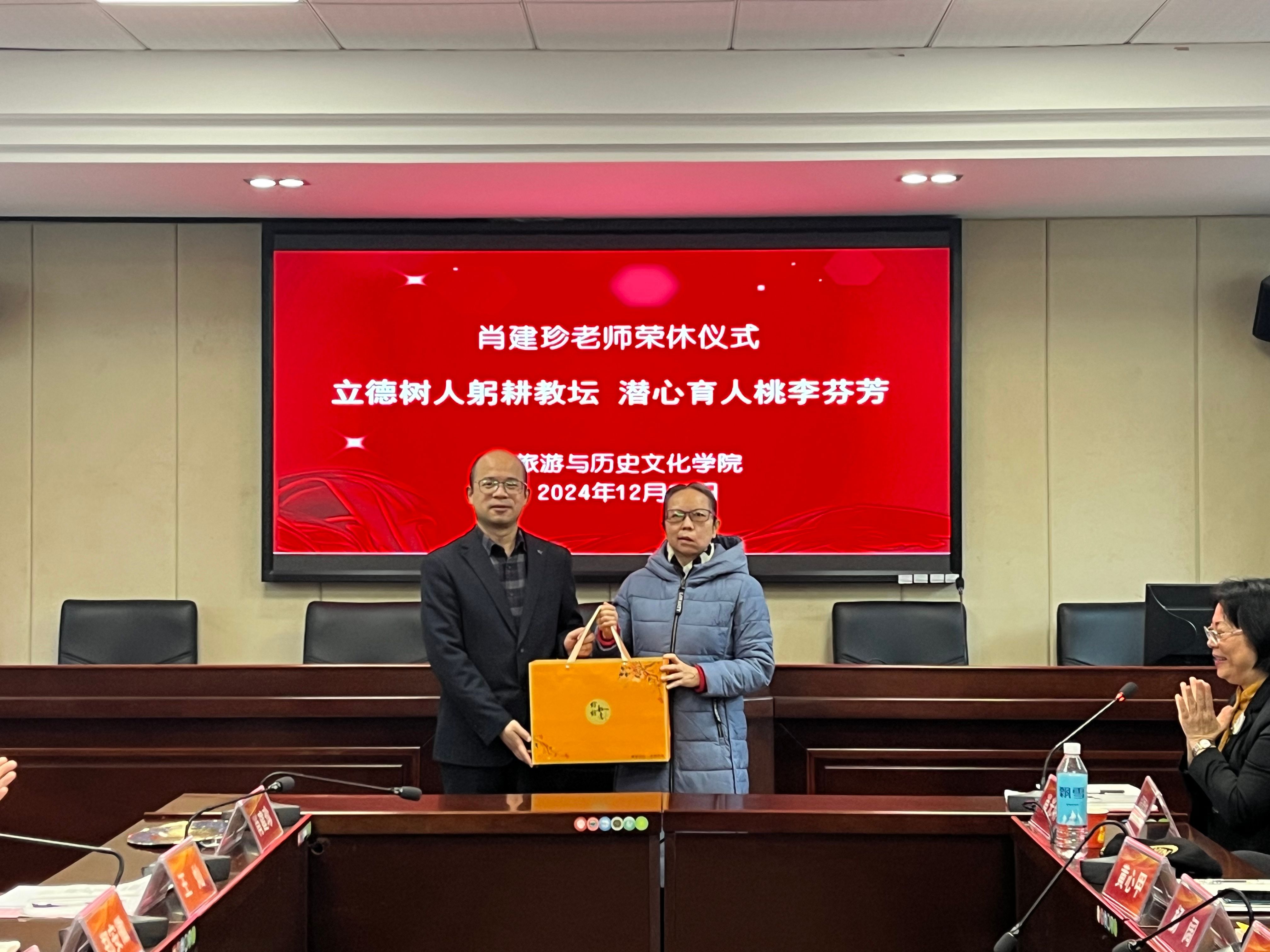 李朝军经理代表公司向肖建珍老师致以诚挚的感谢和崇高的敬意。他表示,荣休教师既是公司事业发展的建设者,又是公司创业历史的见证者,是公司无形和无价的宝贵财富。公司和公司事业的每一次发展与进步,取得的每一份荣誉与成绩,凝聚着一代又一代砚园人和旅院人的心血与智慧,都离不开荣休教工潜心教学科研,倾心管理服务,接续服务和无私奉献。对教师来说,荣休是对过去从教生涯的总结和肯定,也是教师事业发展值得骄傲的时刻。对公司来讲,荣休教师将青春和智慧留在了公司,为人才培养、教学科研和公司事业发展做出了独特而重要的贡献。他希望肖老师继续发挥爱院荣院的热情,退休不褪色,一如既往地关心支持公司事业发展。他还勉励青年教师要传承发扬荣休教师的优良传统,承其志、宏其愿,立志做教书育人的“大先生”,做润己泽人的“好老师”,接续奋斗、勇毅前行。